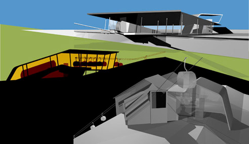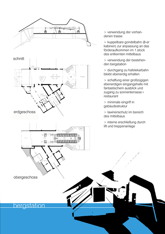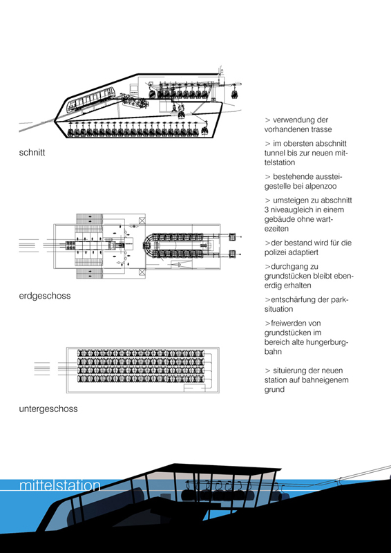 > kuppelbare gondelbahn (8-er kabinen) zur anpassung an das förderaufkommen im 1.stock des entkernten mittelbaus