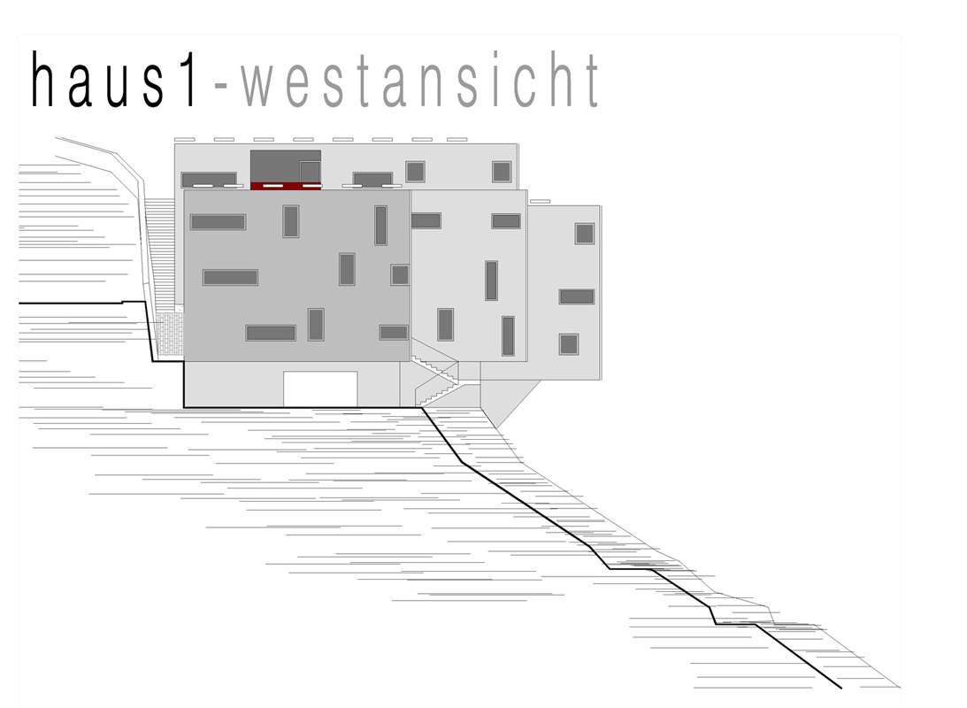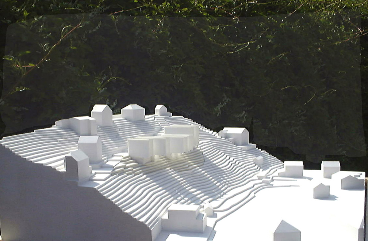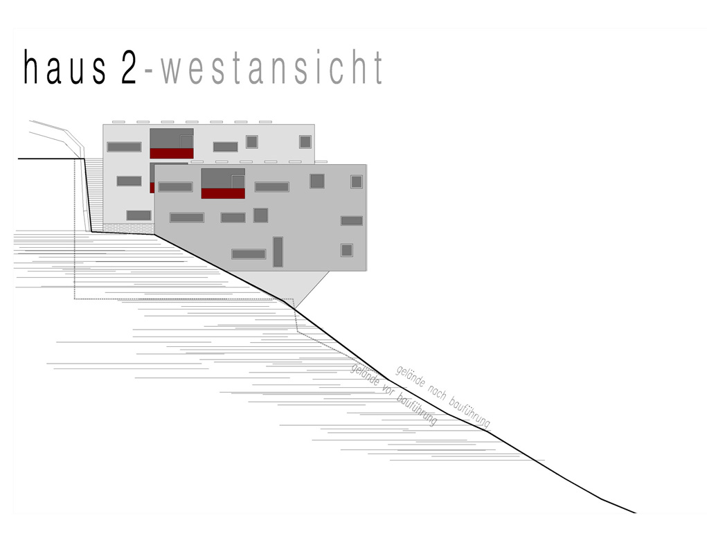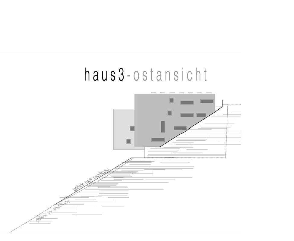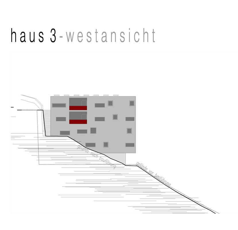 an einem steilen hang knapp über dem talboden schlagen wir die 3-gliederung der Wohnanlage vor, um Durchlässigkeit in der Falllinie zu erhalten und damit die umgebende körnung aufzunehmen.
