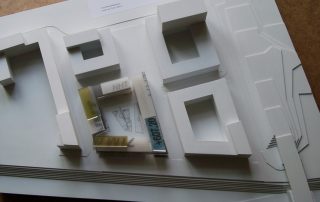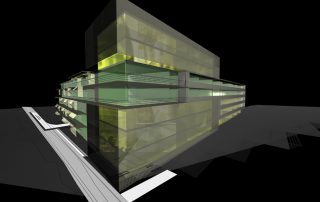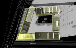 das gebäude ist geprägt durch vertikale schichtung und horizontale verschränkung der blockränder. diese verschränkung bedingt eine belebung des hochpunktes und fasst die einzelnen bauteile in eine adresse. die verstärkung der vertikalen durch das freie aufsetzen der penthouses, das schaffen mehrerer räumlich wirksamer durchgänge bzw. durchbrüche lockert die kubatur der anlage und hat eine durchlüftung des innenhofes zur folge. blickachsen zur sill werden aufgebaut.