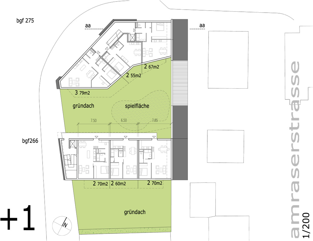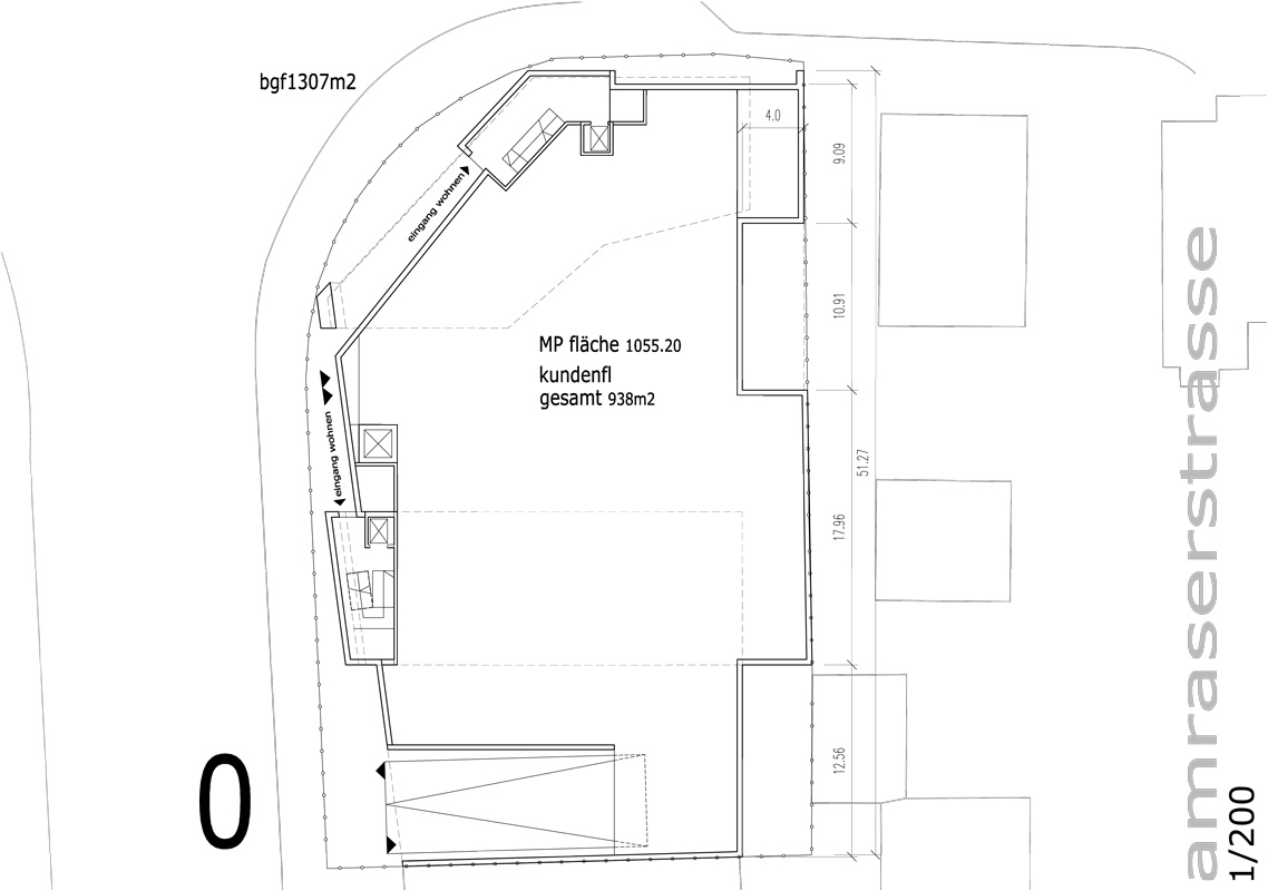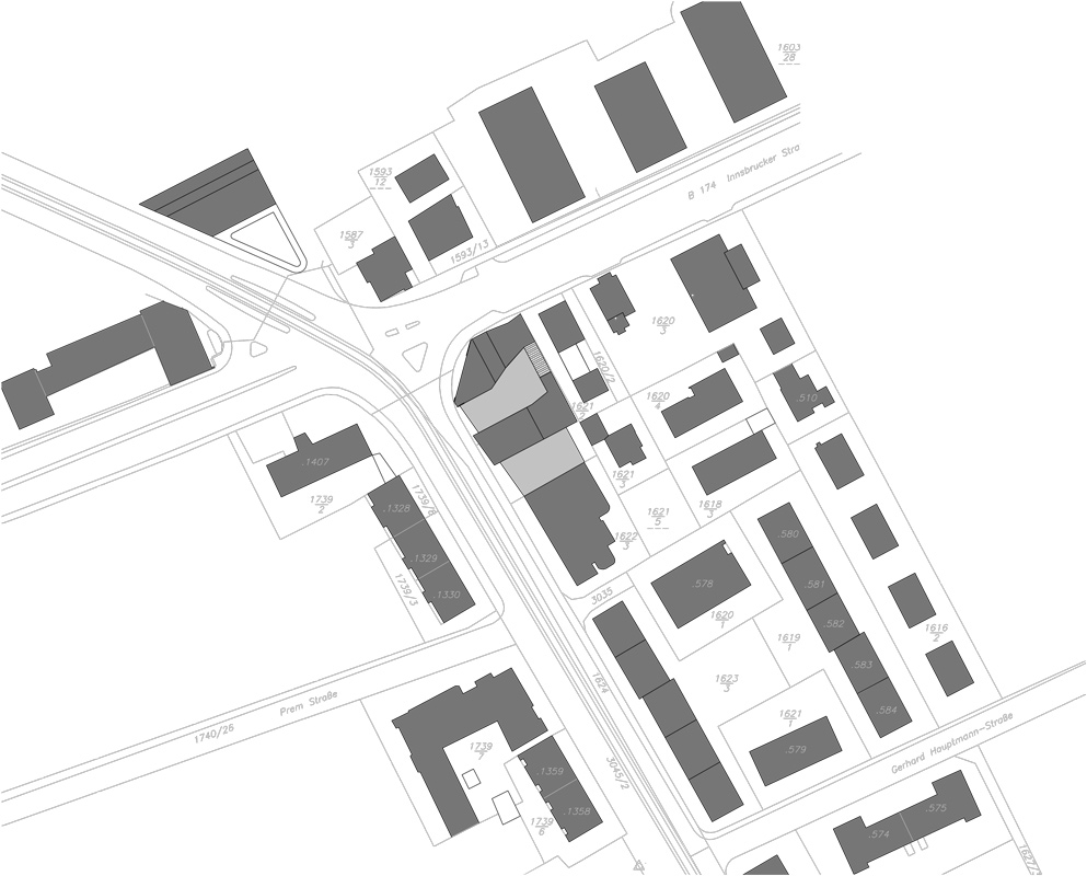 durch zusammenlegung von 2 parzellen kann an einer markanten stelle der innsbrucker stadteinfahrt eine neue und intensivere nutzung entstehen. die in derartigen lagen problematische erdgeschoßzone wird von MPreis genutzt, darüber werden in 2 baukörpern wohnungen errichtet. die anordnung der baukörper nimmt auf die durch den nahen südring entstehende lärmbelastung Rücksicht.