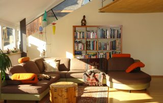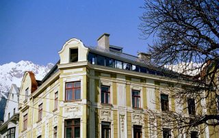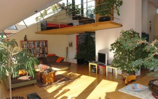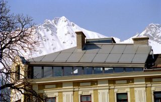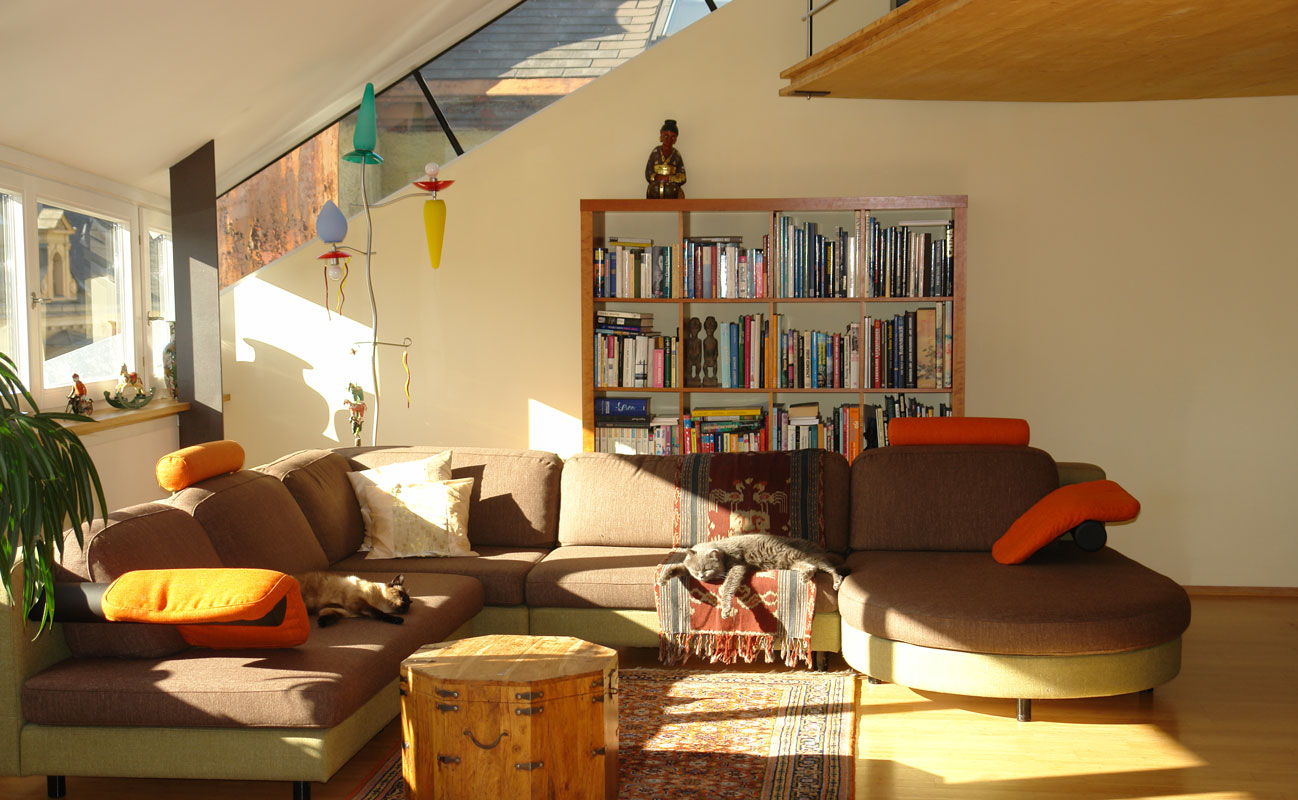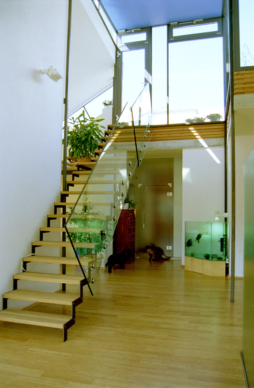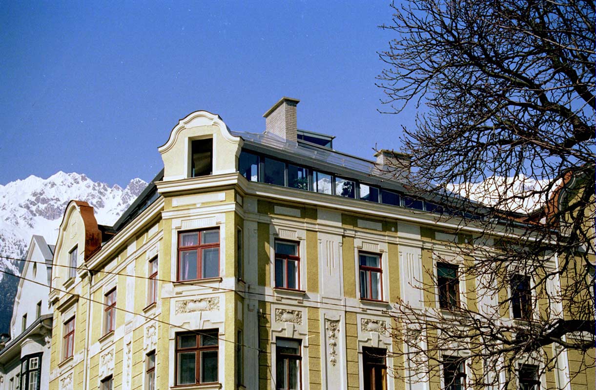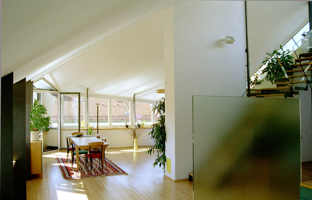 dachausbau unter teilweiser Verwendung des bestandsdaches, das neue dach wurde bis zum baurechtlich erlaubten ausmaß angehoben und leicht gekippt. Die Eindeckung erfolgte mit großformatigen Aluminiumtafeln.