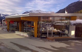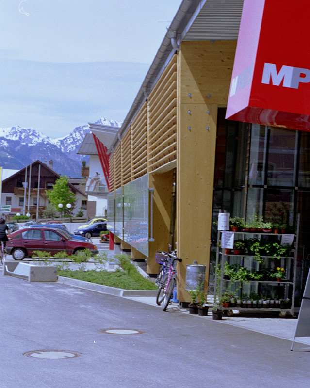 das gebäude liegt, obwohl oberhalb der strasse, etwas tiefer als diese. dadurch kommt das volumen an seinem oberen abschluss im hang zu stehen, dadurch geht der besucher beim zugehen etwas nach unten, das gebäude erweist ihm , dem kunden, respekt.