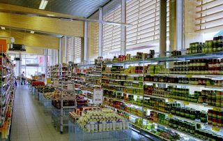 die beleuchtung erfolgt über in die decke eingebaute leuchten mit 2 komponenten. die grundhelligkeit ist eher niedrig gehalten und ungerichtet, einzelstrahler sind als 2. element direkt auf die ware in den regalen gerichtet.