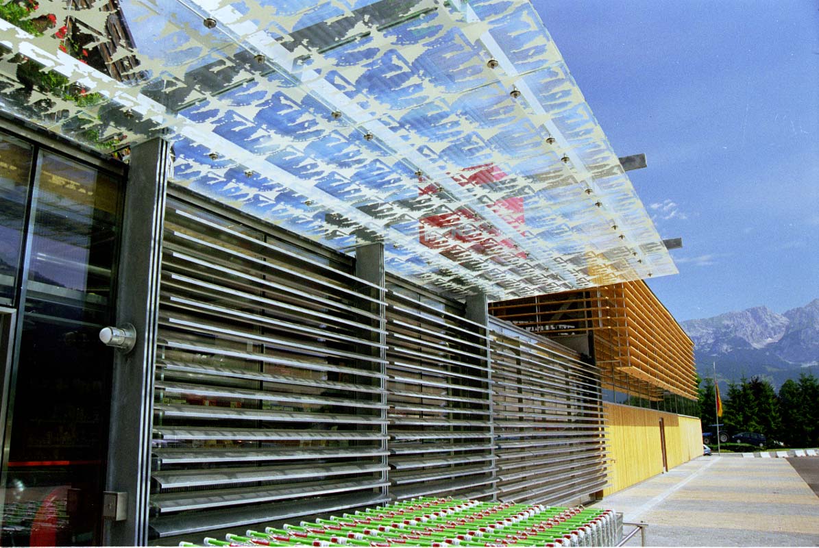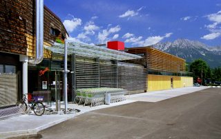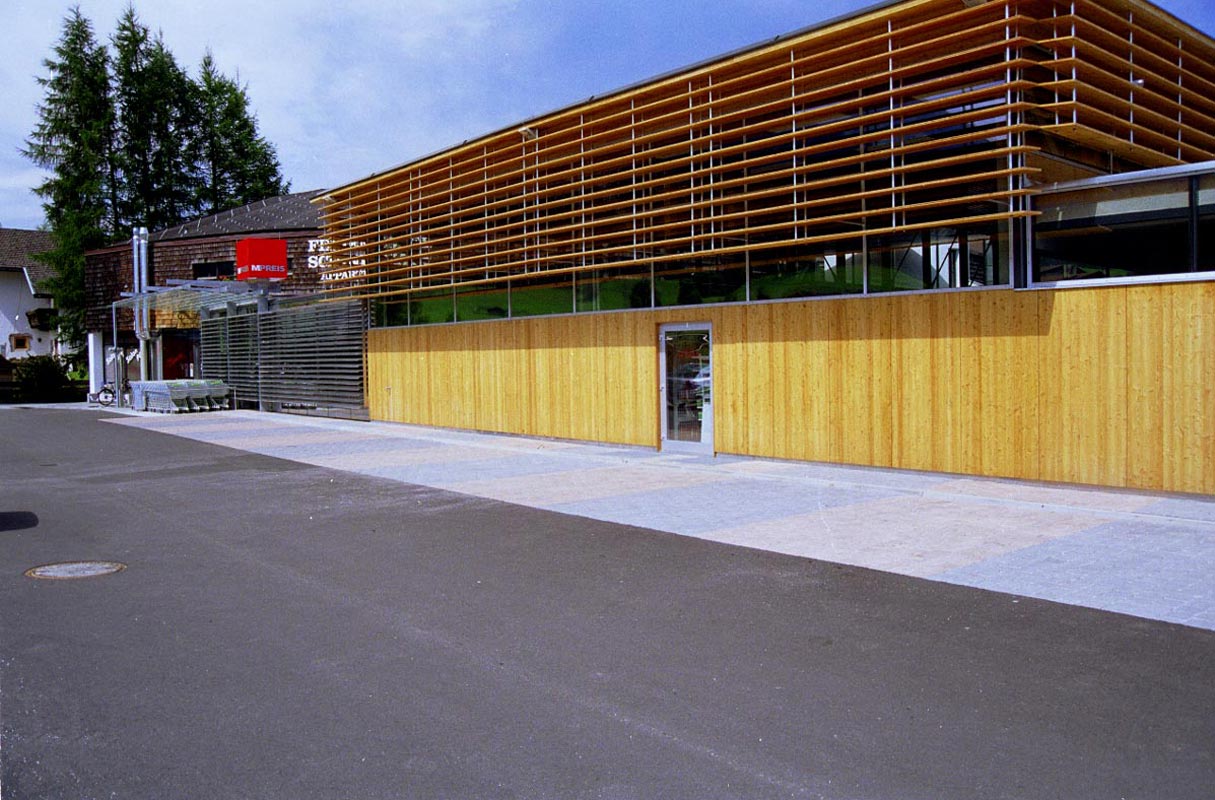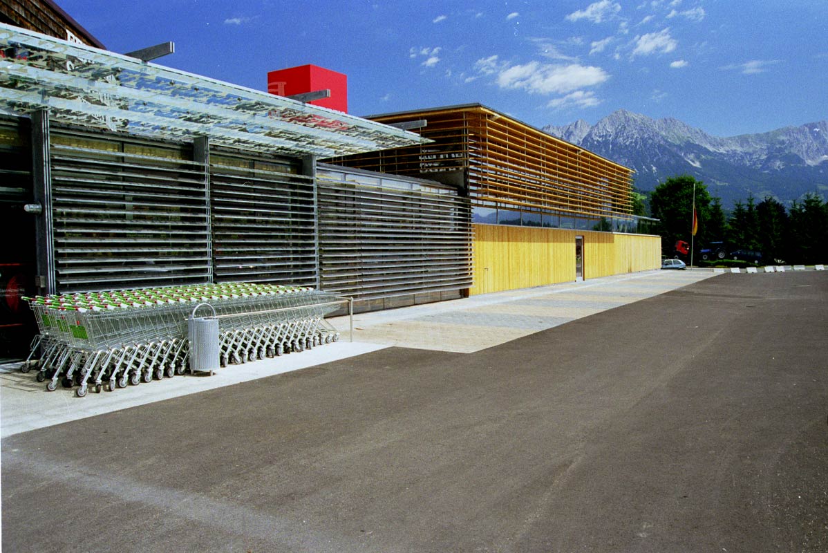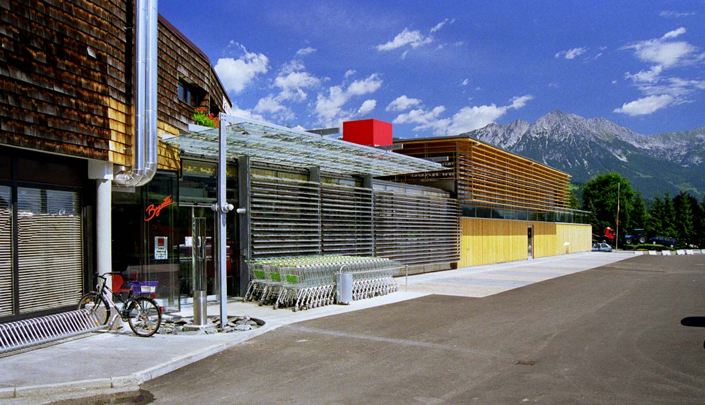 an ein bestehendes tourismusobjekt aus den frühen 80-ern wurde im damaligen parkplatzbereich ein supermarkt angebaut. ein teil des marktes ist im bestand angeordnet, ein teil ragt aus diesem und bildet den anbau.