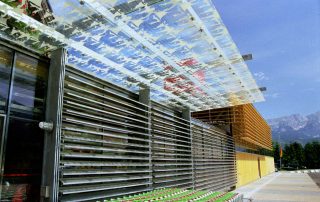die äußere beplankung besteht aus schichtstoffplatten, die, ebenso wie die glasfassade, normal zur schrägen dachkante verlegt sind. Innere oberfläche sind fichtenschichtholzplatten.