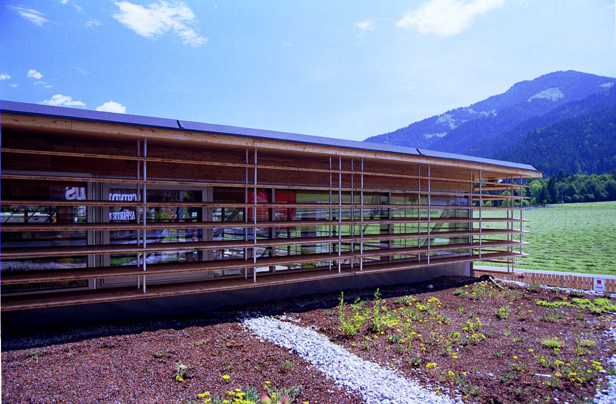 das gebäude nimmt die bereits von der bundesstraße definierte ortsrandlinie auf und verstärkt diese.