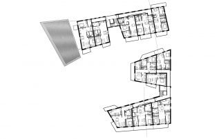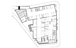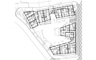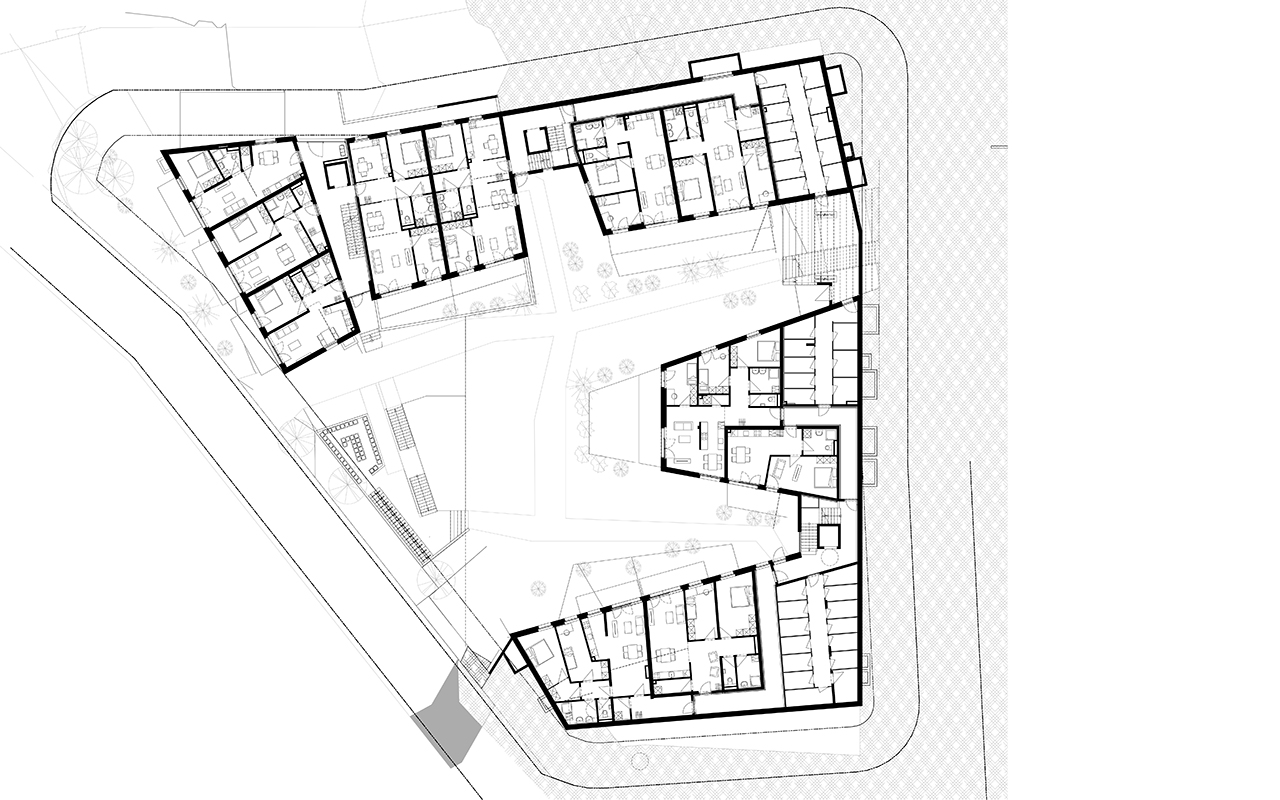 die Gebäude werden entlang des neuen erschließungsweges errichtet, durch die hangneigung entsteht innerhalb ein ebener freiraum.